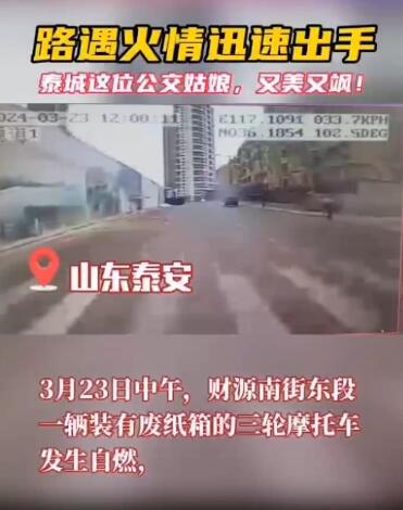 323日中午,財(cái)源南街東段一輛裝有廢紙箱的三輪摩托車(chē)發(fā)生自燃,千鈞一發(fā)之際,泰安公交第一分公司10路線駕駛員張南南拎起滅火器奔向自燃的車(chē)輛,迅速將火情控制并撲滅,得到乘客和路人的一致稱(chēng)贊。